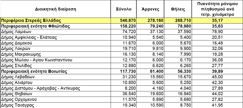 • Η Περιφέρεια Στερεάς Ελλάδας έχει 546.870 κατοίκους (278.160 άντρες-268.710 γυναίκες) και σχετικά μικρή πυκνότητα πληθυσμού (35,17 ανά τετραγωνικό χιλιόμετρο). Κατατάσσεται όγδοη στις 13 Περιφέρειες της χώρας.