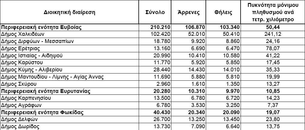 • Η Εύβοια έχει 210.210 κατοίκους (106.870 άντρες-103.340 γυναίκες) και 50,44 κατοίκους ανά τετραγωνικό χιλιόμετρο. Είναι με διαφορά ο μεγαλύτερος νομός της Περιφέρειας, όπως φαίνεται και στον πίνακα που ακολουθεί.